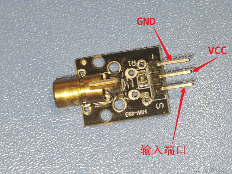 主要就一个引脚注意一下就行,也就是这个丝印是S的引脚,这个脚是单片机给该模块输入数字信号的,输入1时激光头发射激光,输入0时激光头关闭激光。