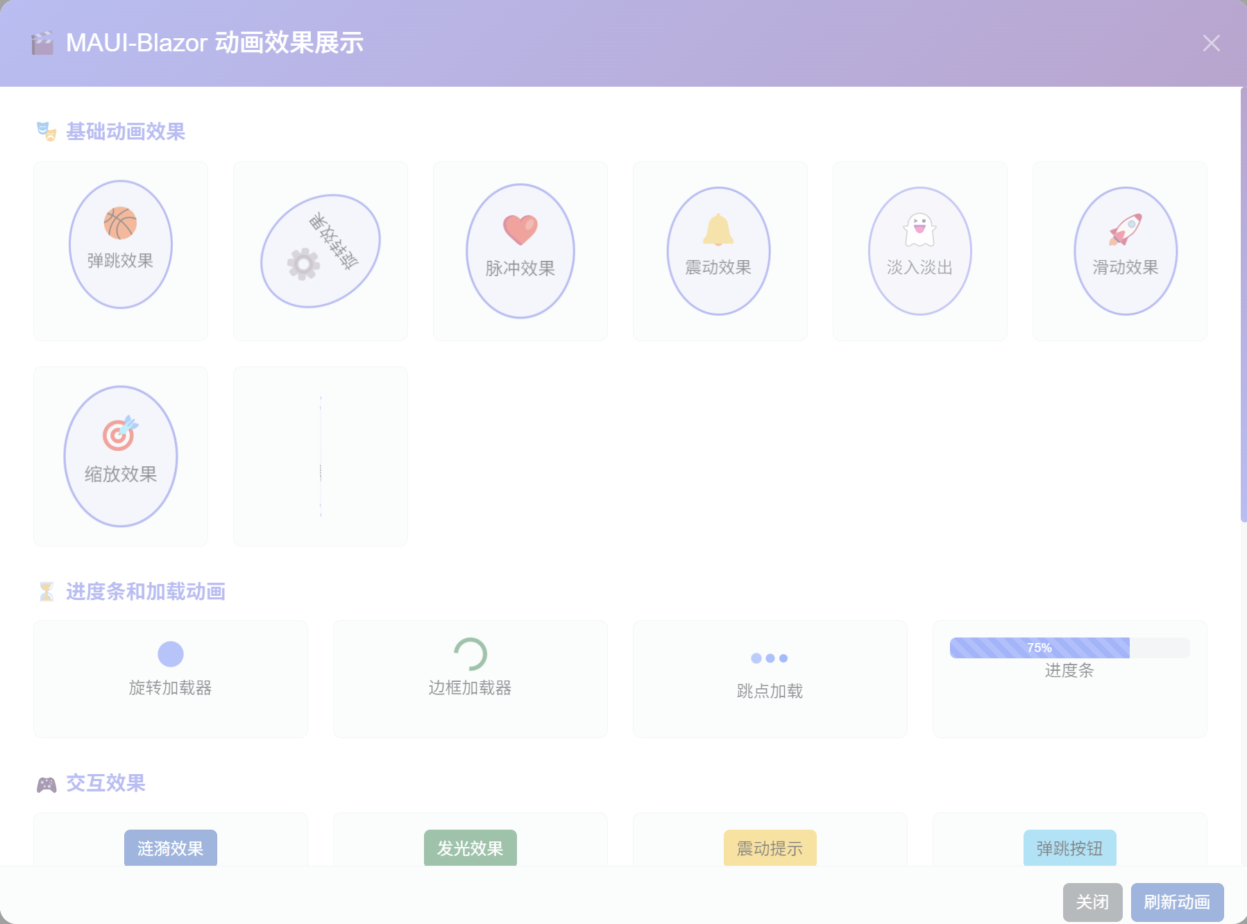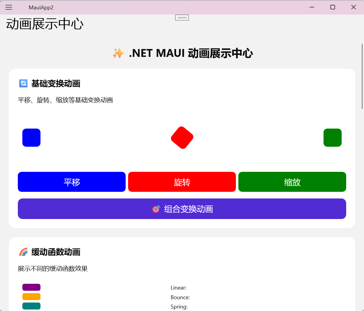 ➤ 排名第四的是 MAUI,作为多端的原生应用,可能是它的重点是在于跨多端,因此它的动画效果虽然算是比较多样,但是仍然看起来比较简单,而且有多种动画我并没有看到效果,有可能与兼容性有关系: