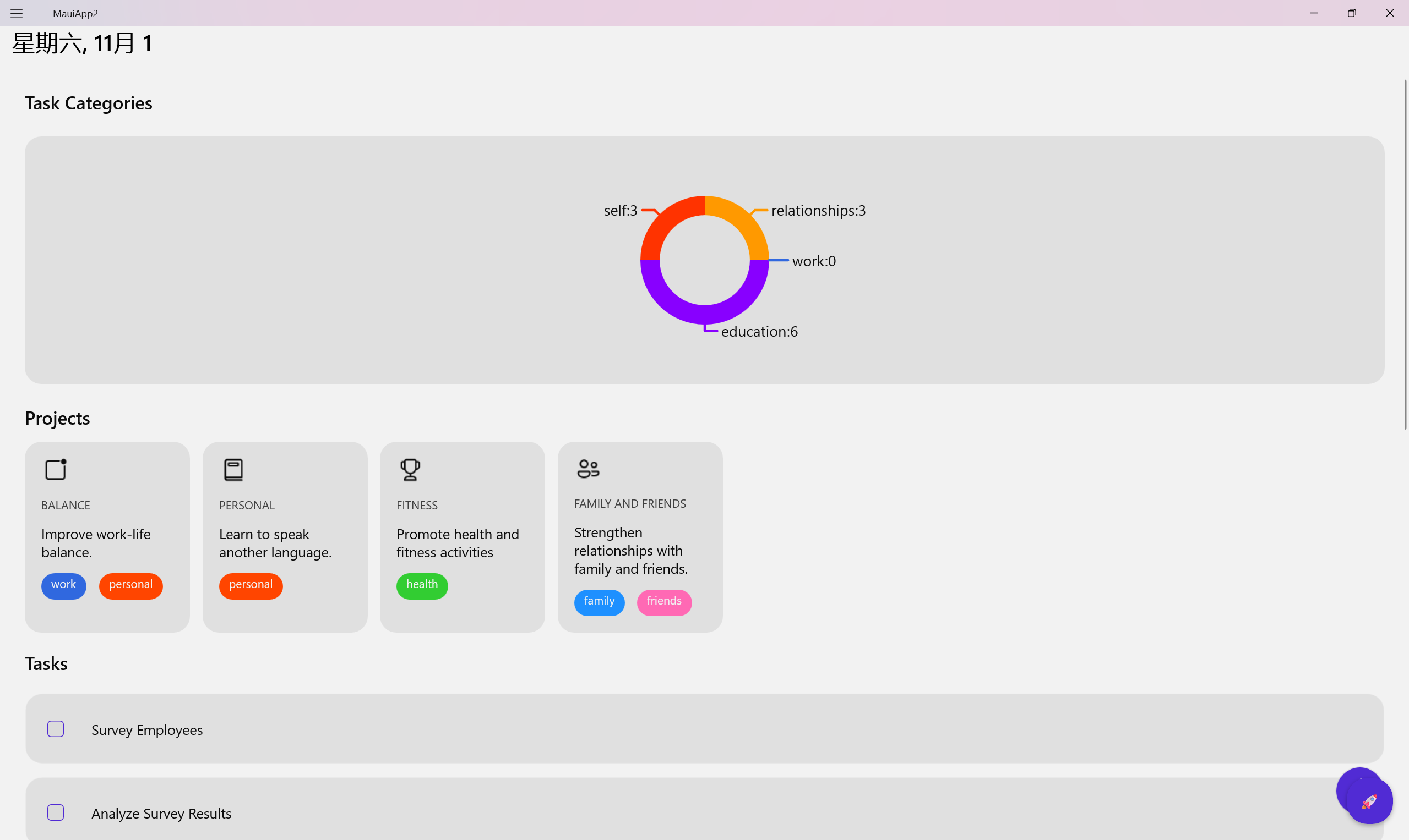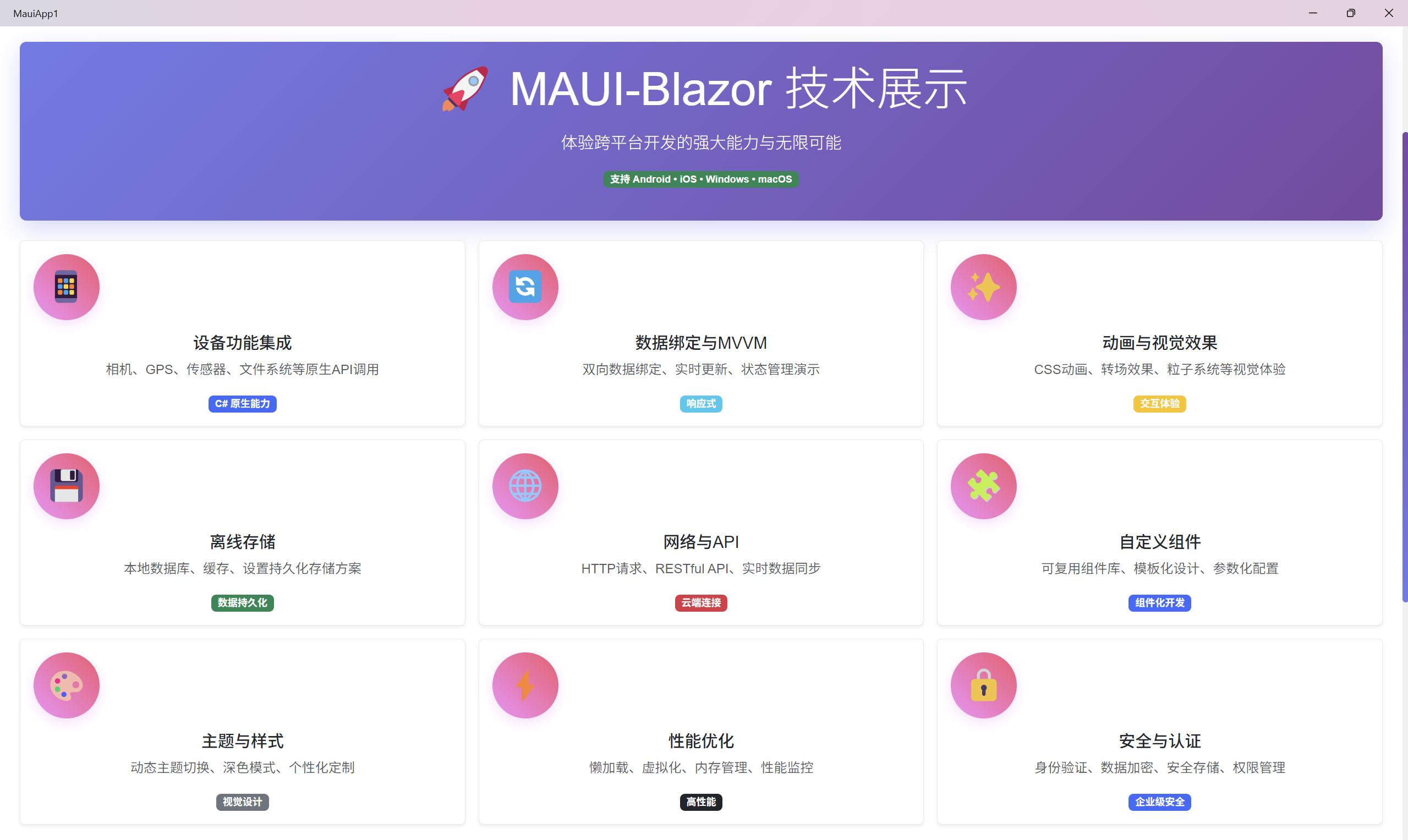 ➤ 排名第三和第二的比较接近,分别是 MAUI Blazor 和 WPF, MAUI Blazor 的页面是典型的web风格,给人一种绚丽多彩的感觉,看起来功能非常丰富,也支持获取多端的硬件能力,但是能够明显地感觉到偶尔的卡顿,或者是页面的动作稍微有一点点延迟的感觉,有那种web自带的"飘"感 或者是 "蹦一下 "的感觉,但是动画本身是非常流畅的,整体的感觉就是:太丰富多彩了,但是有点不稳: