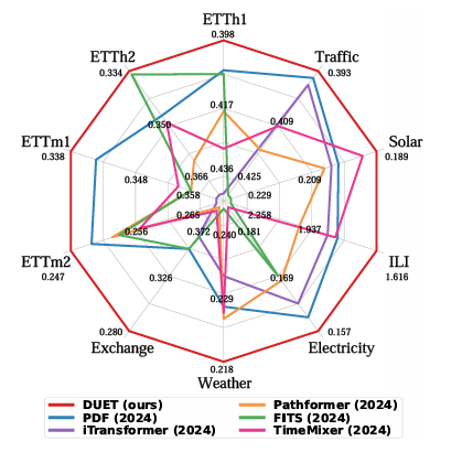 DUET 首次在时间与通道维度同时引入聚类,分别解决 TDS 异质性与通道关联复杂性,突破传统单维度优化的局限。通过时间 - 通道双聚类的协同设计,有效解决多变量时间序列预测中的异质时间模式与复杂通道关联问题,在电力、交通、经济等多领域数据集上展现出鲁棒性与适应性。