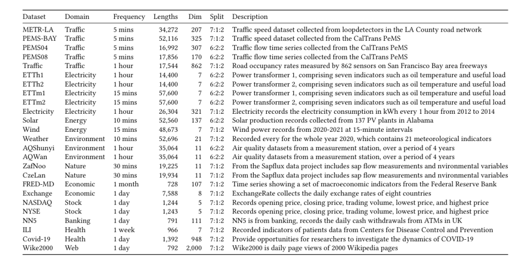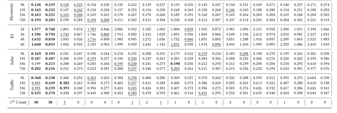 数据集:覆盖 10 个领域的 25 个真实数据集(如电力 ETT 系列、交通 Traffic、经济 Exchange、健康 ILI 等),主实验报告 10 个代表性数据集结果,其余 15 个见代码库。