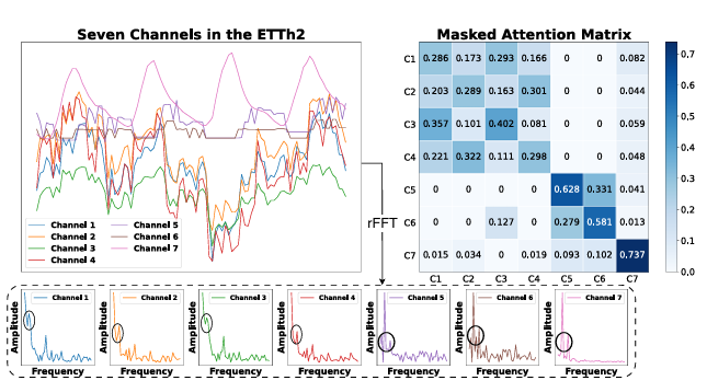 通道注意力:ETTh2 的通道掩码矩阵显示,相似频域特征的通道形成软簇,且保留跨簇弱关联(如 C6 与 C3 的 0.127 权重),兼顾灵活性与信息完整性。