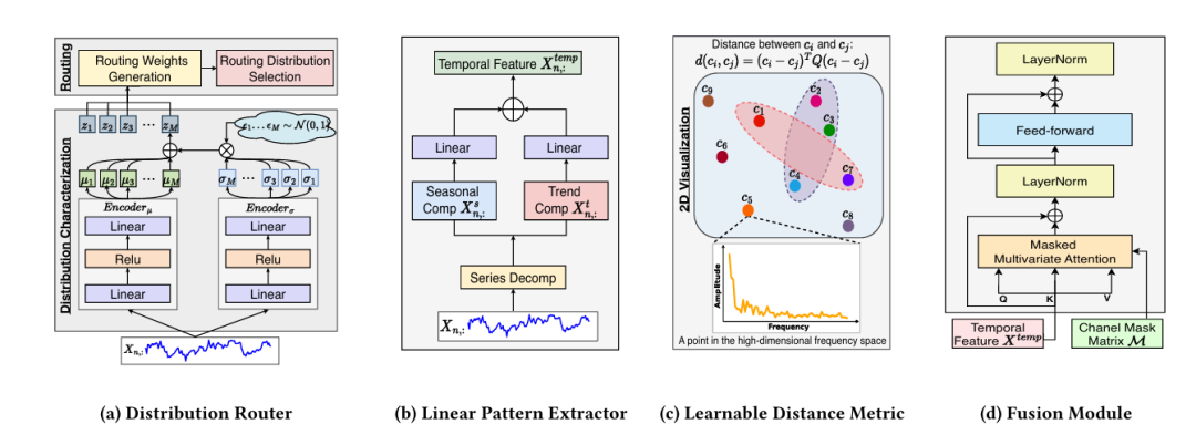 线性基模式提取器簇:为每个分布簇配置独立的线性基提取器,通过移动平均技术将时间序列分解为 "趋势项" 与 "季节项",分别用线性模型提取特征后融合,在保证特征提取精度的同时,维持模型轻量化(避免百万级参数冗余)。