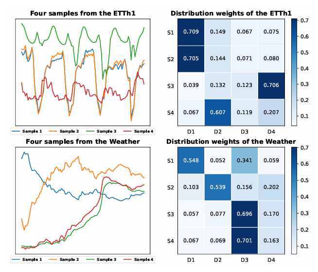 时间分布权重:同分布的时间序列样本(如 ETTh1 的 S1 与 S2)权重相似,异分布样本差异显著,证明 TCM 的聚类有效性;