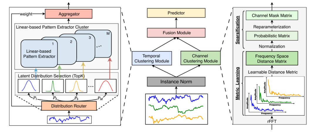 核心目标:解决时间分布偏移(TDS)导致的异质时间模式问题,通过将时间序列按潜在分布聚类,为不同分布簇匹配专属模式提取器,精准捕捉各类时间特征。
