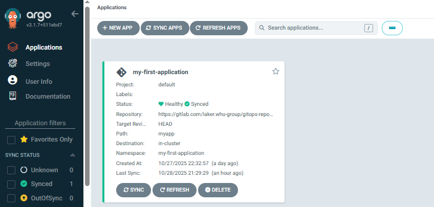 使用 kubectl get applications -A应该能输出刚刚部署的application: