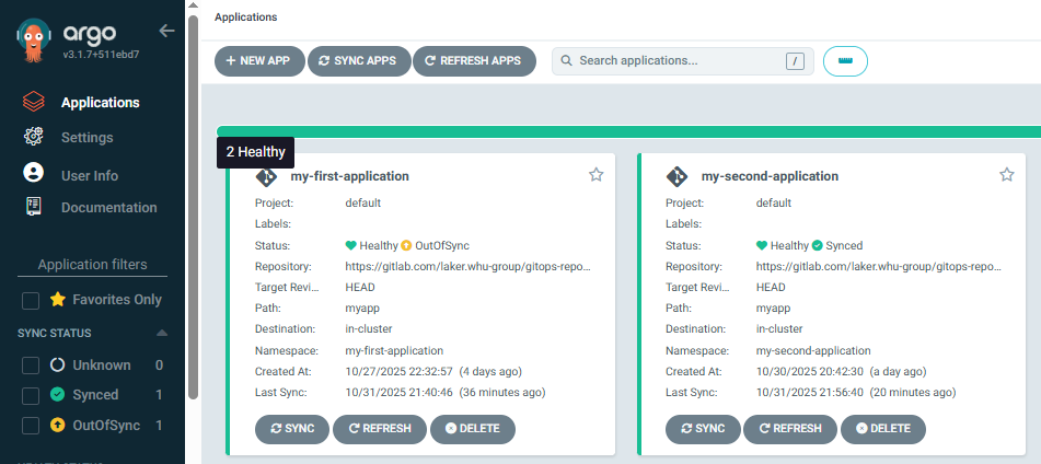这条命令会在 argocd 命名空间中创建一个名为 my-second-application 的 ArgoCD 应用: