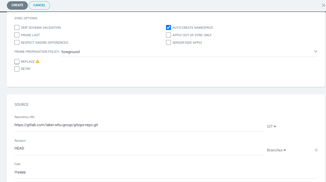 Path: 填入deployment.yaml所在的目录,在我的示例中,位于gitops-repo底下的myapp中,故填写myapp,如果直接位于gitops-repo下,填写"."即可