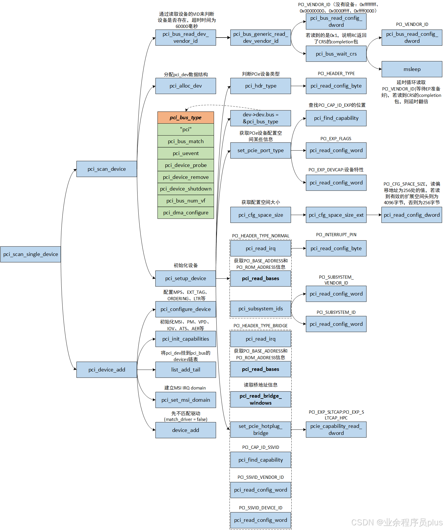 - 配置、初始化和管理Function。主要是配置MPS、Extended Tags、ordering、LTR等,初始化MSI、PM、VPD、IOV、ATS、AER等,将pci_dev挂到pci_bus的devices链表,最后建立MSI IRQ domain。