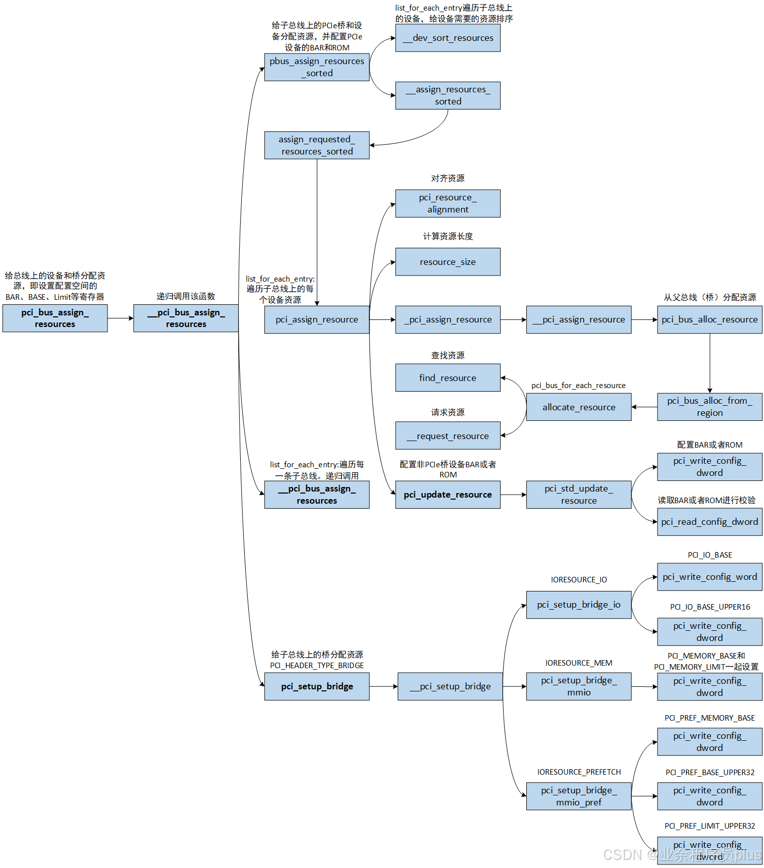 内核使用pci_bus_assign_resources函数给PCIe桥和非桥设备分配资源。详细的流程如下所示。针对每一条子总线,递归调用__pci_bus_assign_resources分配资源。一条子总线上的设备和桥分配资源的步骤如下: