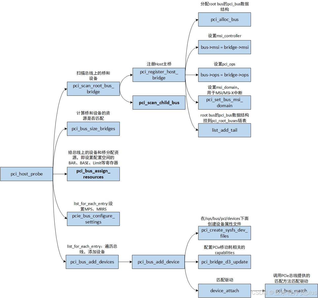 Linux内核中,PCIe RC驱动调用pci_host_probe函数枚举PCIe总线上的所有设备。pci_host_probe的执行流程如下图所示,总共有5部分,具体如下:
