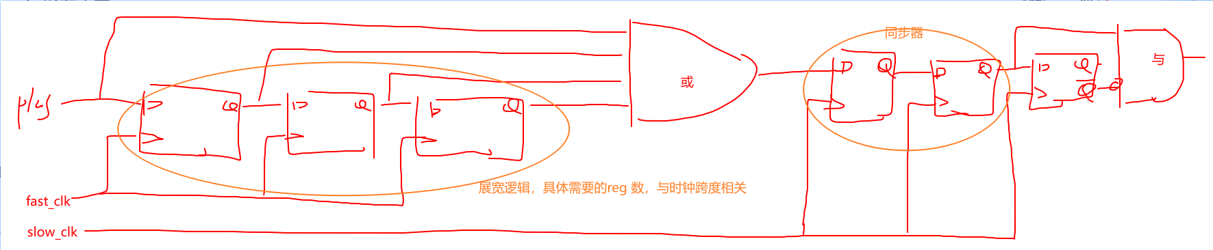 根据快时钟和慢时钟的频率关系,将快时钟的脉冲信号使用shift reg 后,对脉冲展宽(展宽后的脉冲在慢时钟域满足三个沿的原则)。 在慢时钟域,使用同步器对展宽后的脉冲采样,并捕获器上升沿作为跨时钟后的脉冲信号。