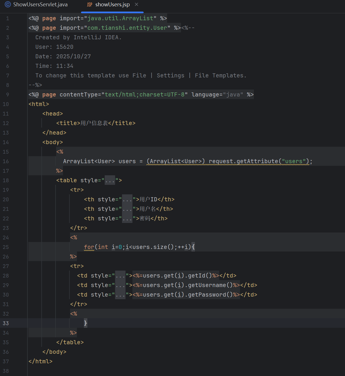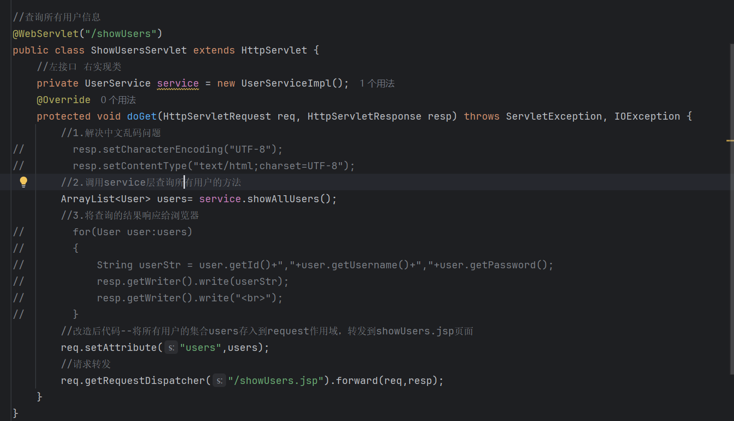 将所有用户的集合users存入到request作用域,转发到showUsers.jsp页面