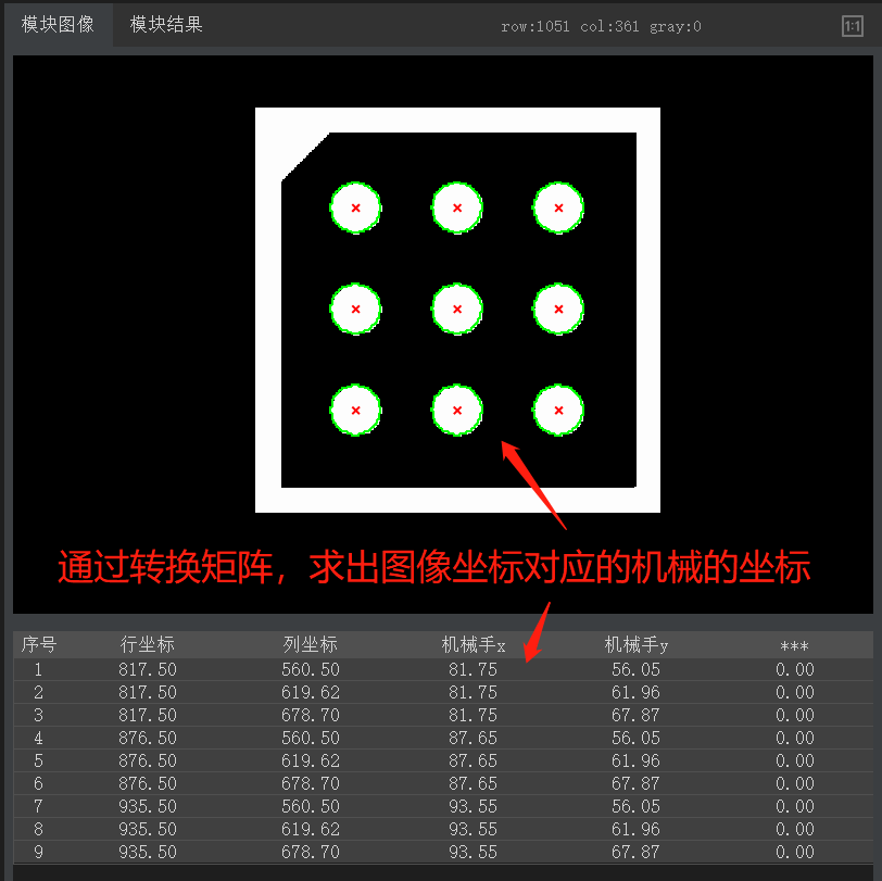 利用该算子,输入图像坐标与机械手坐标,算出转换关系矩阵,用于机械手引导定位。