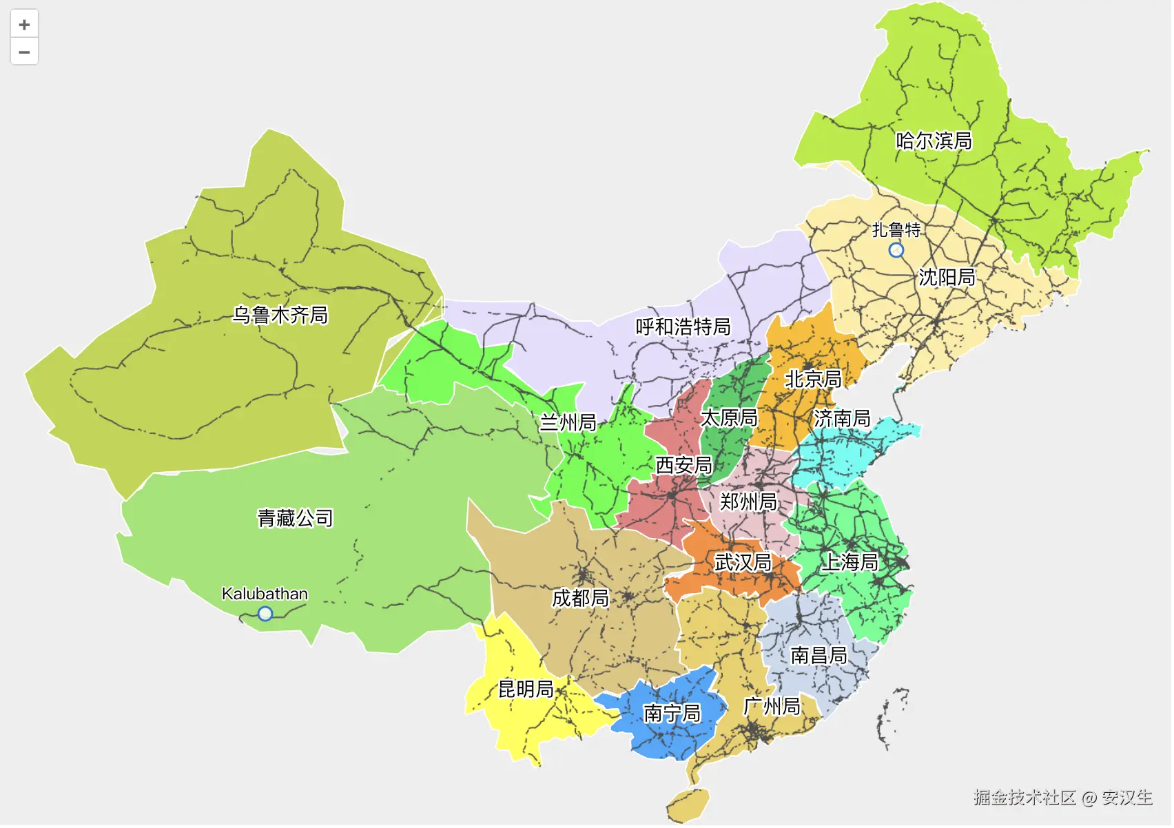 铁路线数据数据量大,将数据分块后并行加载,在浏览器端使用 geojson-vt 切分为矢量瓦片,通过自定义 tileLoadFunction 动态生成 OpenLayers 要素,并仅在 zoom ≥ 4 时显示灰色铁路线,兼顾性能、内存和渲染效率