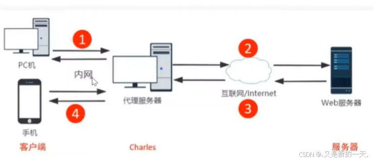 也就是说客户端给Web服务器发送请求是通过Fiddler发,响应同理。中间代理的作用。