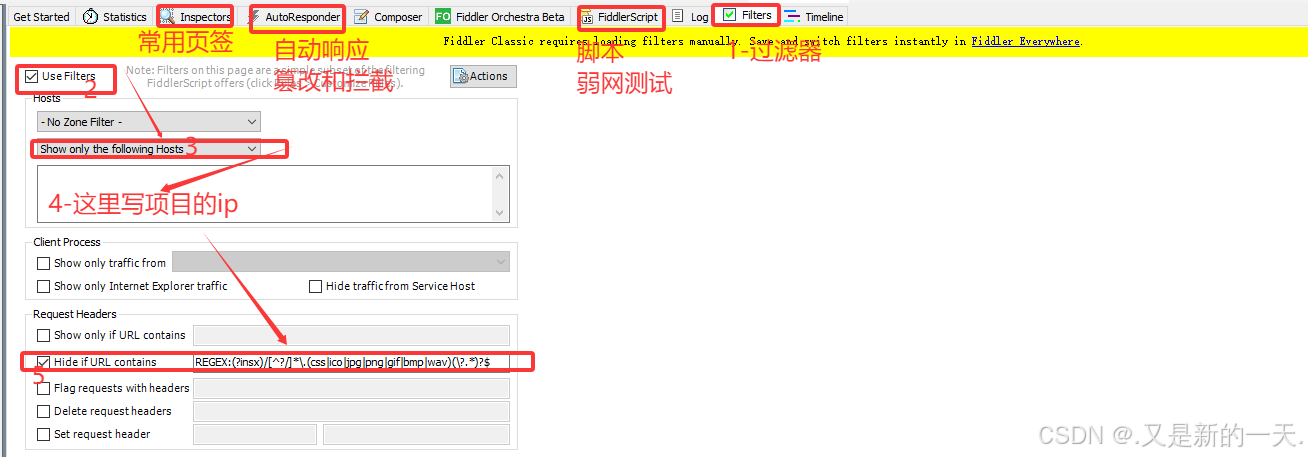 在 Fiddler 的 "Hide if URL contains" 中,过滤无用信息的常用固定写法(基于正则表达式)是: