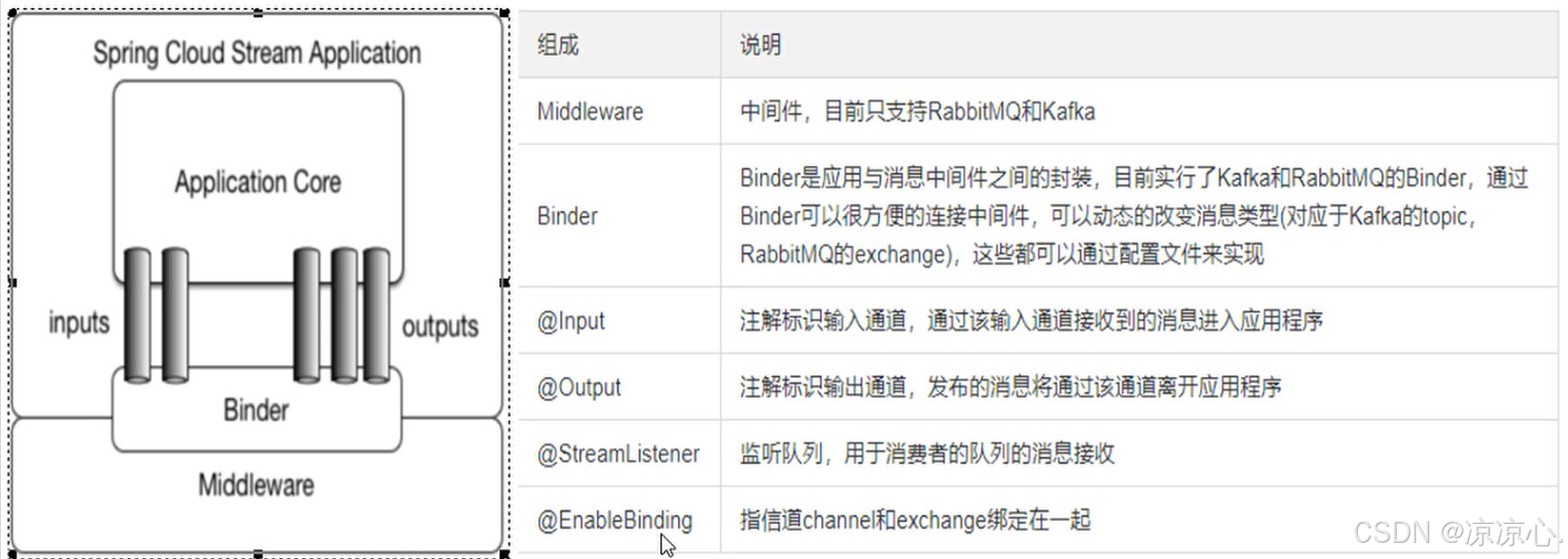 应用程序通过 inputs 或者 outputs 来与 SpringCloud Stream 中的binder对象交互