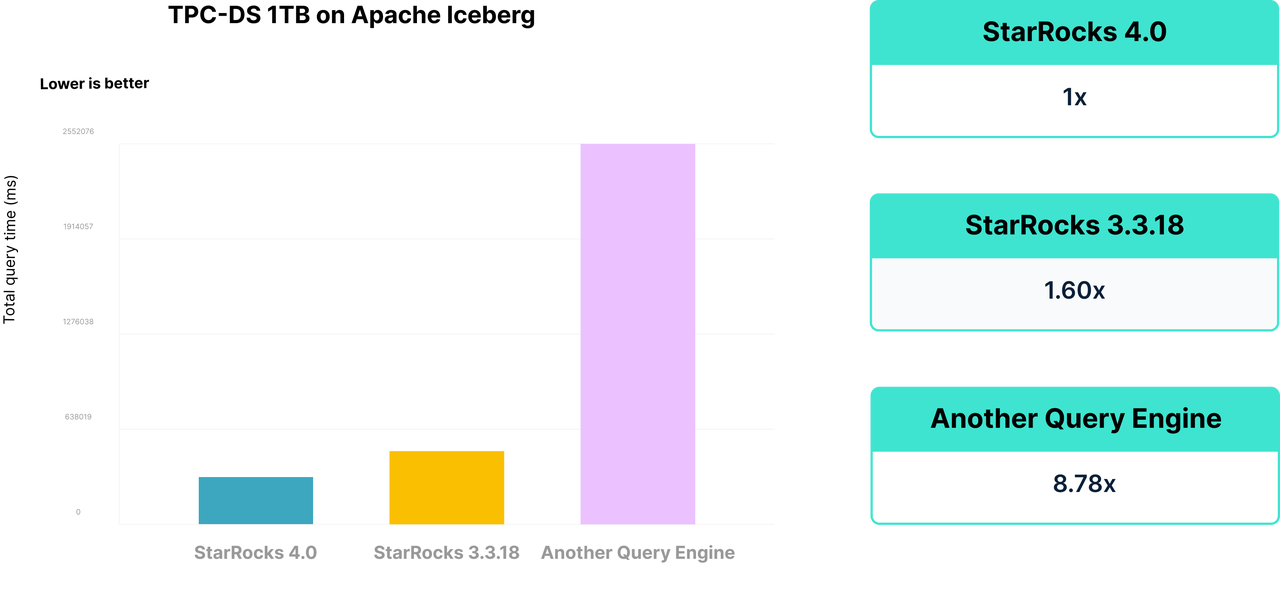 StarRocks 4.0 大版本将实现湖仓原生分析 ------将 StarRocks 多年来在数仓场景积累的优化经验,应用到开放格式之上,让用户基于 Iceberg 构建湖仓像使用 StarRocks 内表一样简单。在使用内表时,用户无需关注文件布局或统计信息,数据写入即可查询;而如今,这种"写入即查询"的体验,同样适用于 Iceberg 等开放格式。