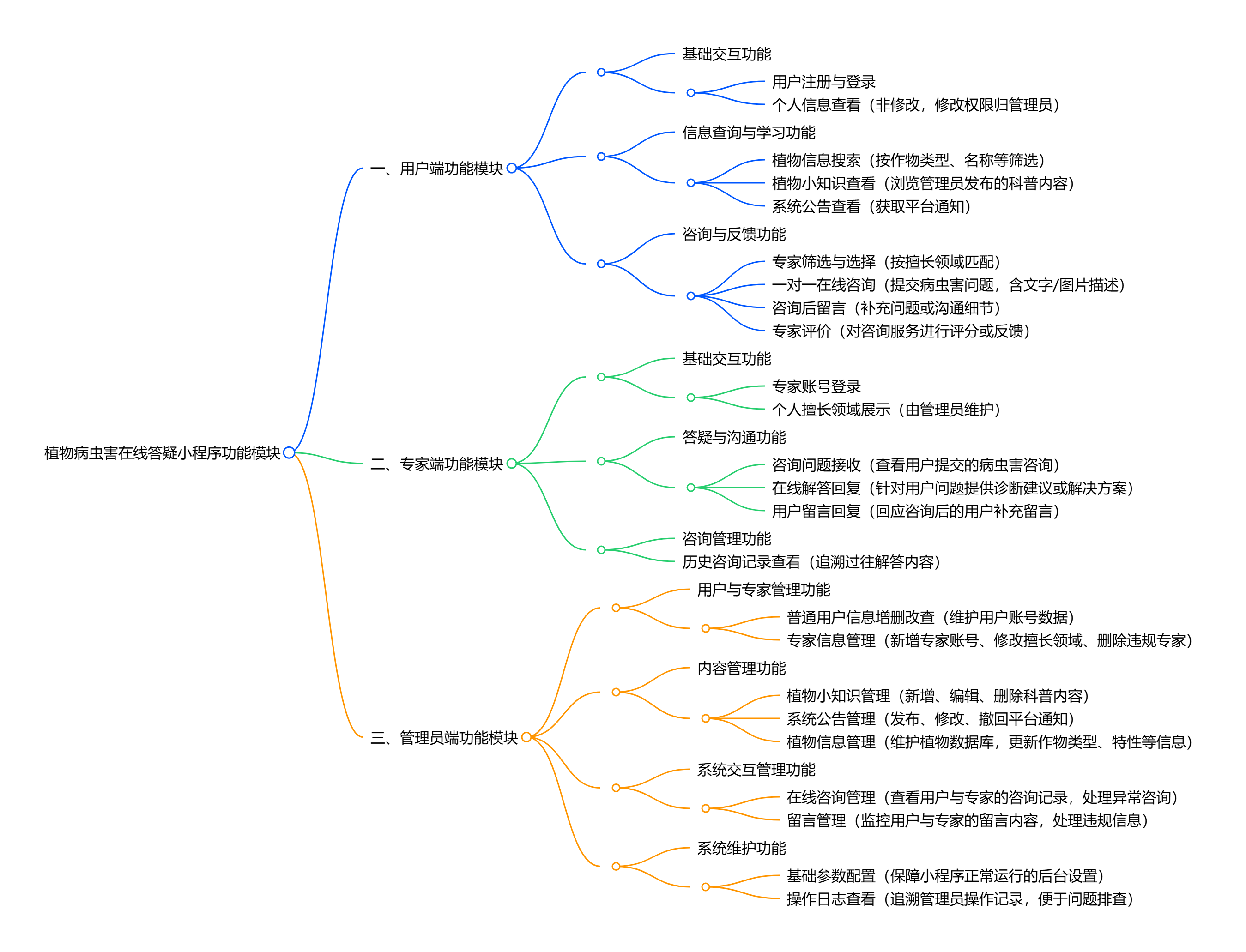 植物病虫害在线答疑小程序围绕用户、诊断专家、管理员三类角色设计核心功能,具体可概括为: