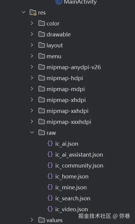 这里通过app:lottie_rawRes来指定为raw目录下的动画资源,另外要是指定assets目录下的JSON,可以使用app:lottie_fileName属性,例如