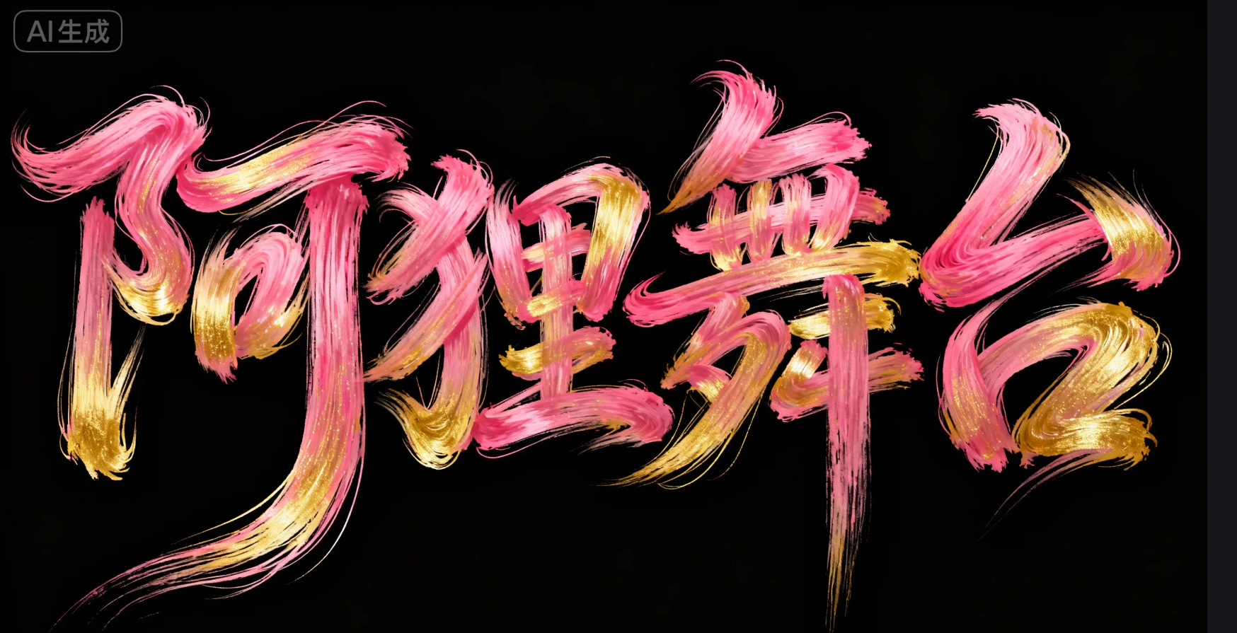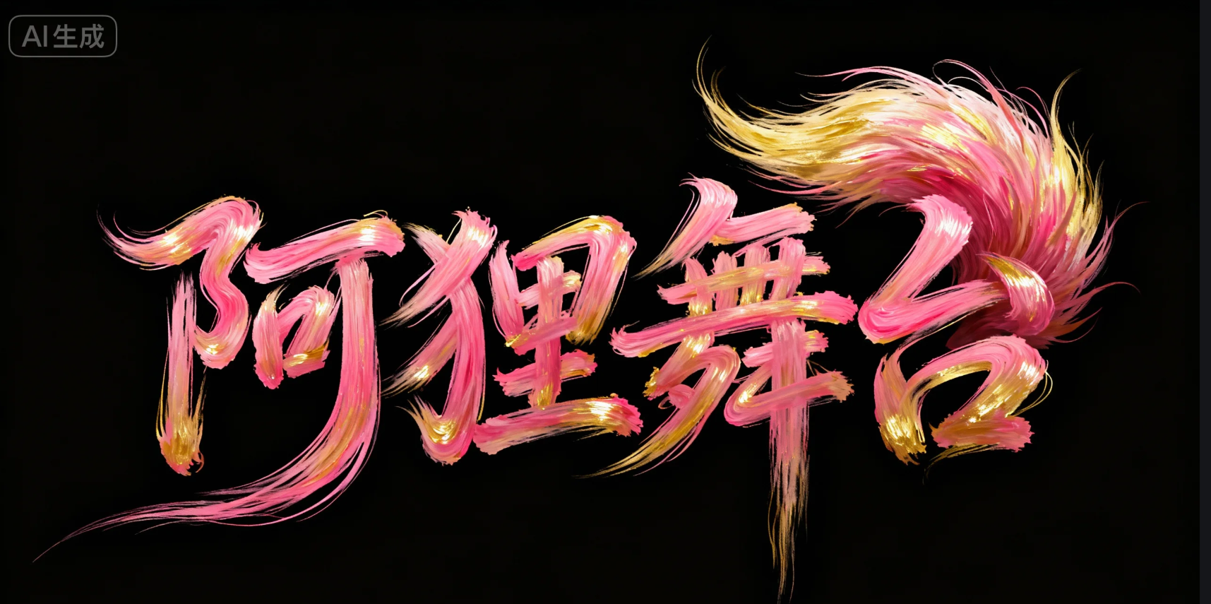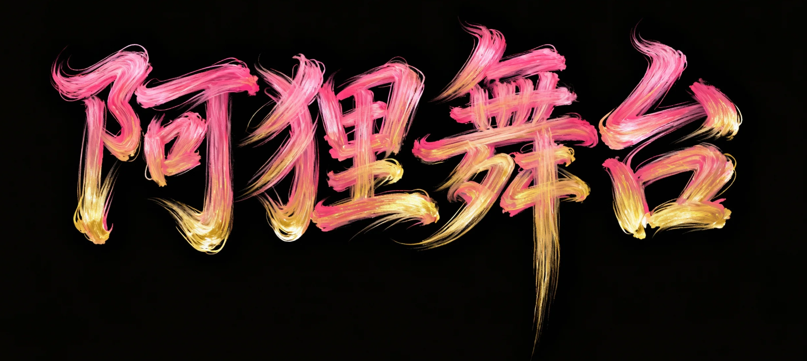 黑色背景,画面中央为抽象艺术字体"阿狸舞台",整体字形由流动毛发状笔触构成,线条如飘逸发丝,融合书法草书节奏。笔触颜色以粉红色与金黄为主,色彩过渡自然,富有光泽与层次感。字形结构错落有致,融入风之动感与水的流线感,营造出一种灵性与自由的视觉体验。整体风格极具表现主义,适用于艺术签名、视觉实验字体、数字书法、新东方意象等场景。