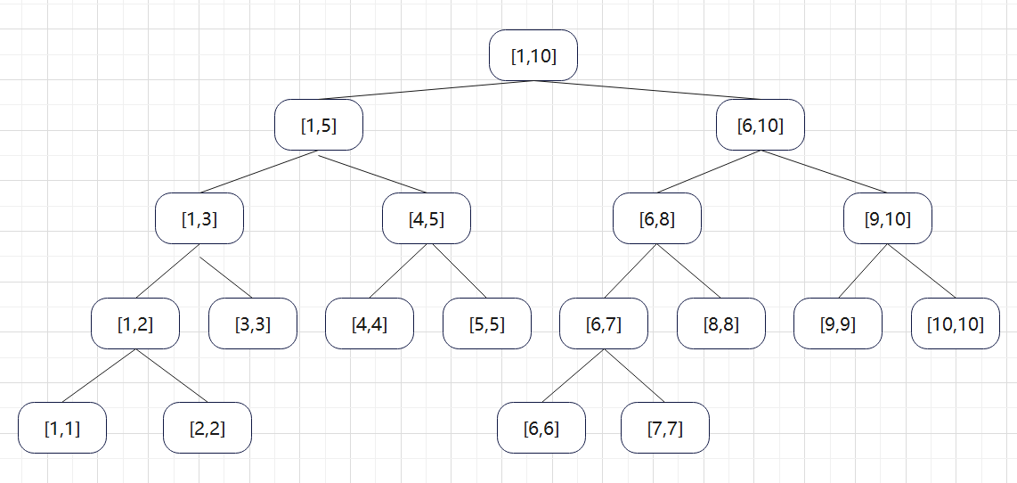 L=R,说明这个节点只有一个元素,是一个叶子节点。L<R,说明这个节点代表多个元素,它有两个孩子,左孩子 [L,M] ,右孩子 [M+1,R],其中M=(L+R)/2。