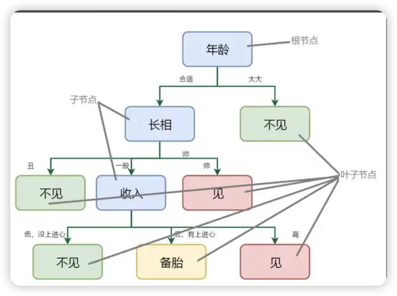 内部节点:每个内部节点代表一个特征属性上的测试条件,比如上面决定是否出门游玩例子中的 "天气是否晴朗",它决定了数据应该沿着哪条分支继续向下传递