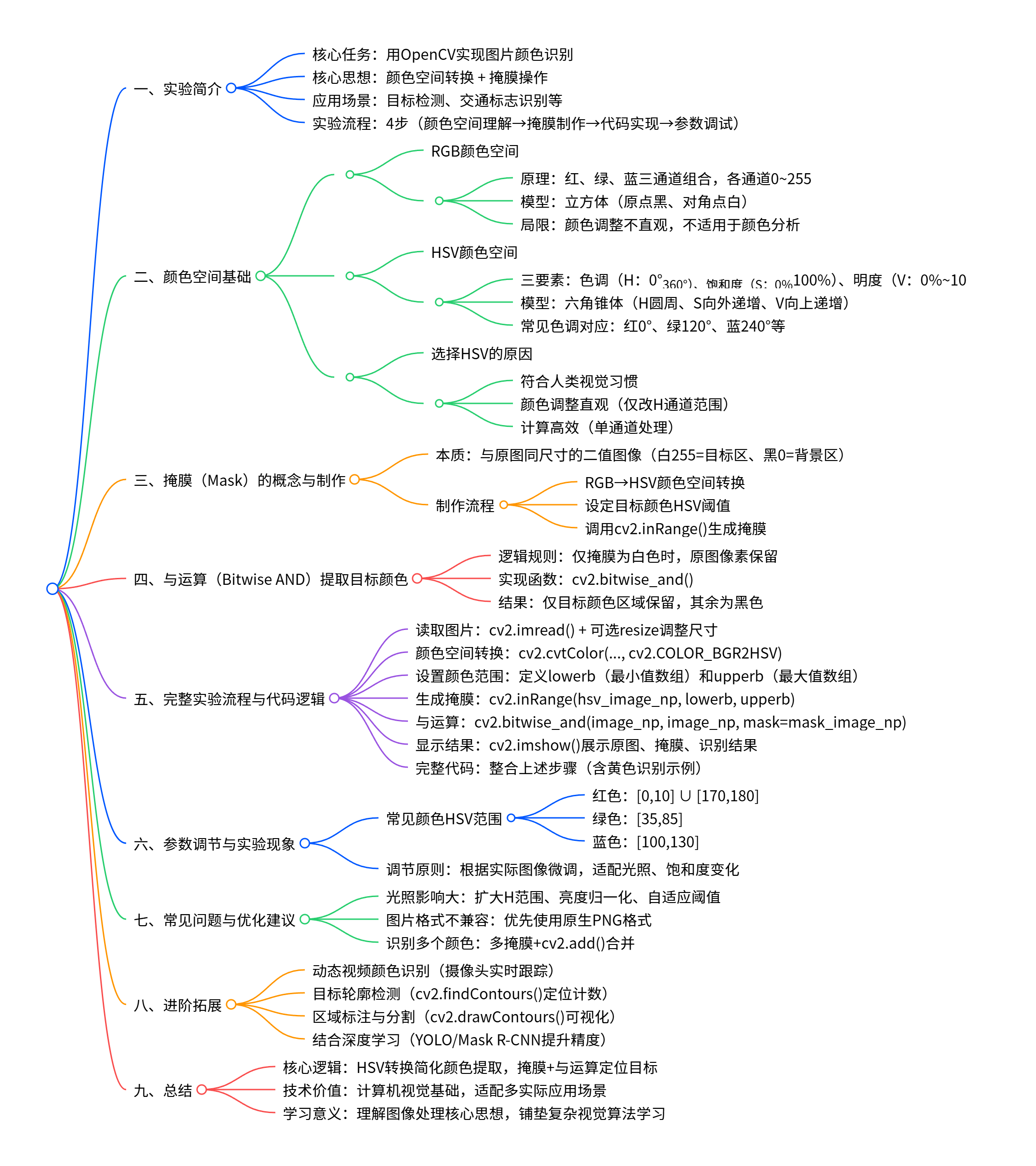 本实验将介绍如何使用OpenCV实现图片颜色识别 ,核心思想是利用颜色空间转换与**掩膜(Mask)**操作,从图像中提取目标颜色区域。