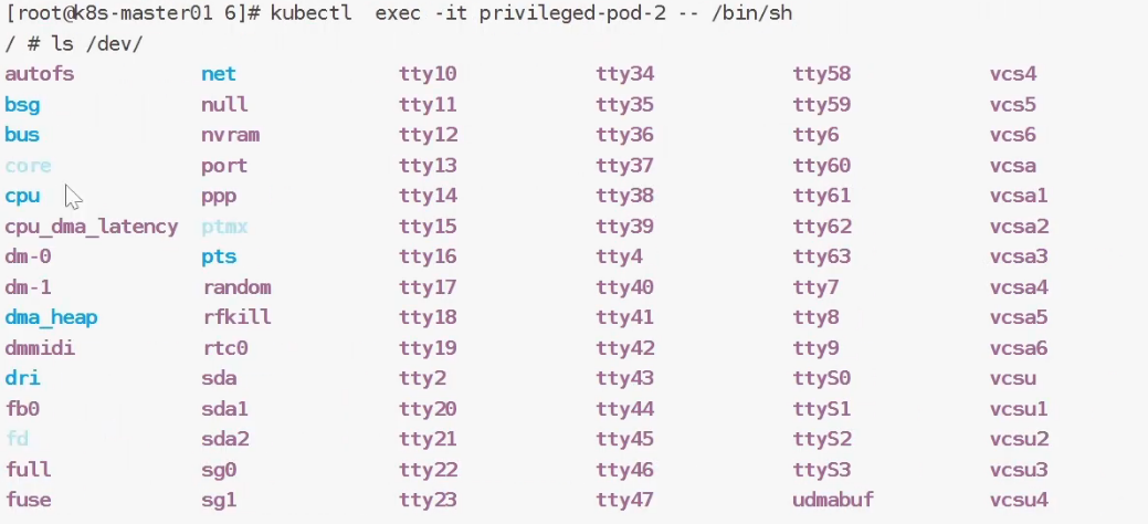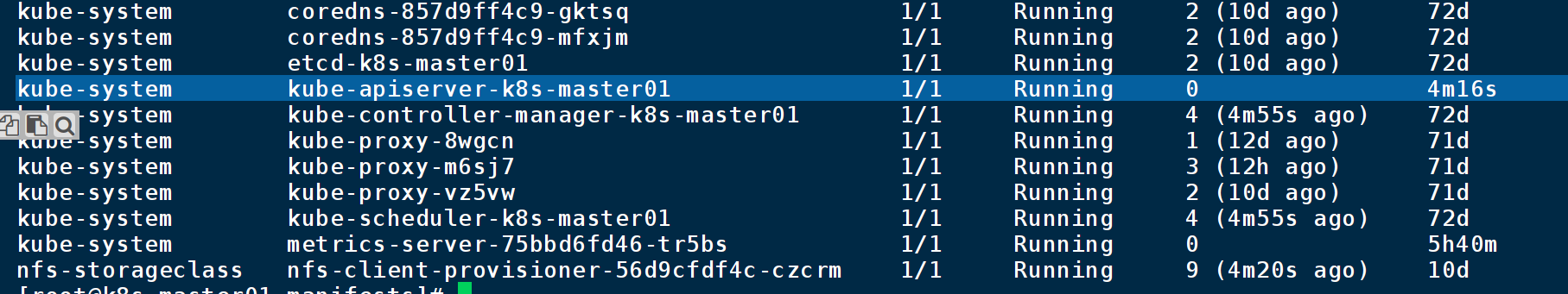 spec: containers: - command: - kube-apiserver - --audit-policy-file=/etc/kubernetes/audit-policy/policy.yaml - --audit-log-path=/etc/kubernetes/audit-logs/audit.log - --audit-log-maxsize=7 - --audit-log-maxbackup=2 volumeMounts: - mountPath: /etc/kubernetes/audit-policy/policy.yaml name: audit-policy readOnly: true - mountPath: /etc/kubernetes/audit-logs name: audit-logs readOnly: false volumes: - name: audit-policy hostPath: path: /etc/kubernetes/audit-policy/policy.yaml type: File - name: audit-logs hostPath: path: /etc/kubernetes/audit-logs type: DirectoryOrCreate稍后,get pod -A