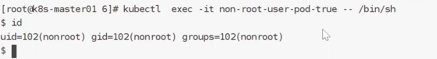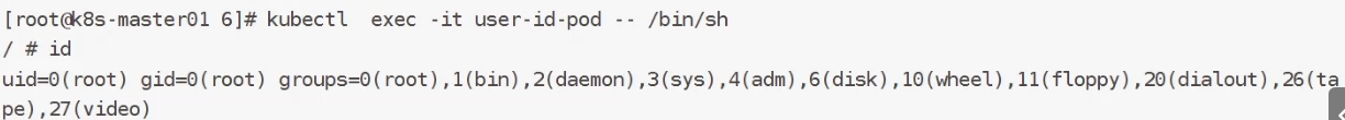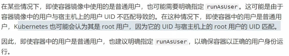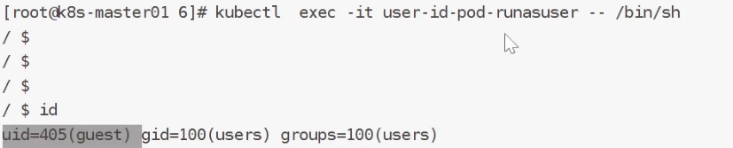 apiVersion: v1 kind: Pod metadata: name: user-id-pod spec: containers: - name: myapp-container image: wangyanglinux/myapp:v1.0 command: ["/bin/sleep", "9999"] # 保持容器运行 securityContext: runAsUser: 405 # 指定运行容器的用户 UID不加用户id