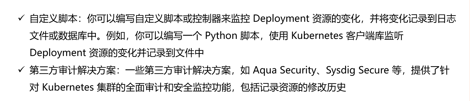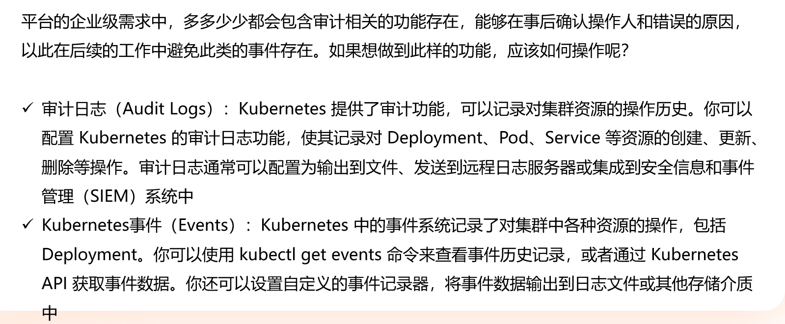 记录集群内安全相关的时序操作,包括「操作人、时间、资源、操作类型、结果」等,用于事后追溯、异常检测和安全合规。