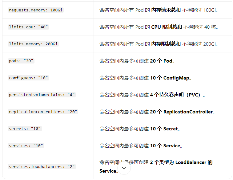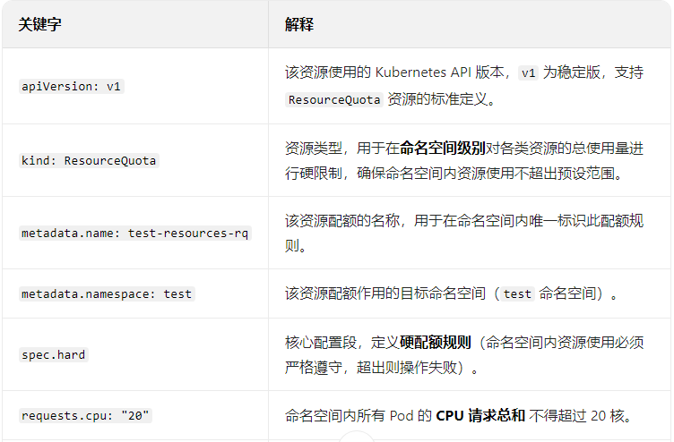 ResourceQuota的核心作用是在命名空间维度进行资源总量管控,防止单个团队 / 项目过度占用集群资源,是 Kubernetes 多租户资源隔离与治理的关键工具之一。