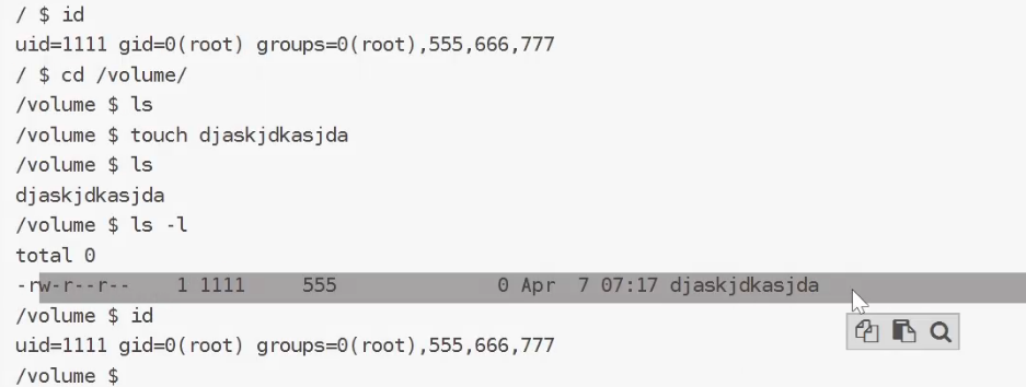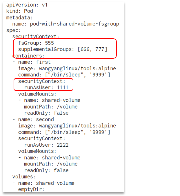 apiVersion: v1 kind: Pod metadata: name: pod-with-shared-volume-fsgroup spec: securityContext: fsGroup: 555 # 共享存储的属组 ID(挂载后文件属组为 555) supplementalGroups: [666,777] # 补充属组(容器内进程额外加入 666、777 组) containers: - name: first image: wangyanglinux/tools:alpine command: ["/bin/sleep", "9999"] securityContext: runAsUser: 1111 # 容器运行用户 UID volumeMounts: - name: shared-volume mountPath: /volume readOnly: false - name: second image: wangyanglinux/tools:alpine command: ["/bin/sleep", "9999"] securityContext: runAsUser: 2222 # 第二个容器的运行用户 UID volumeMounts: - name: shared-volume mountPath: /volume readOnly: false volumes: - name: shared-volume emptyDir: {} # 共享临时存储卷