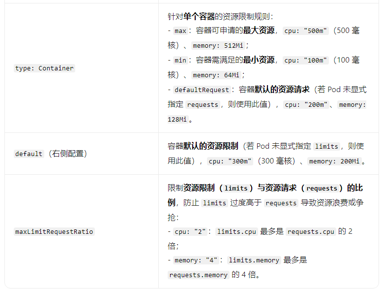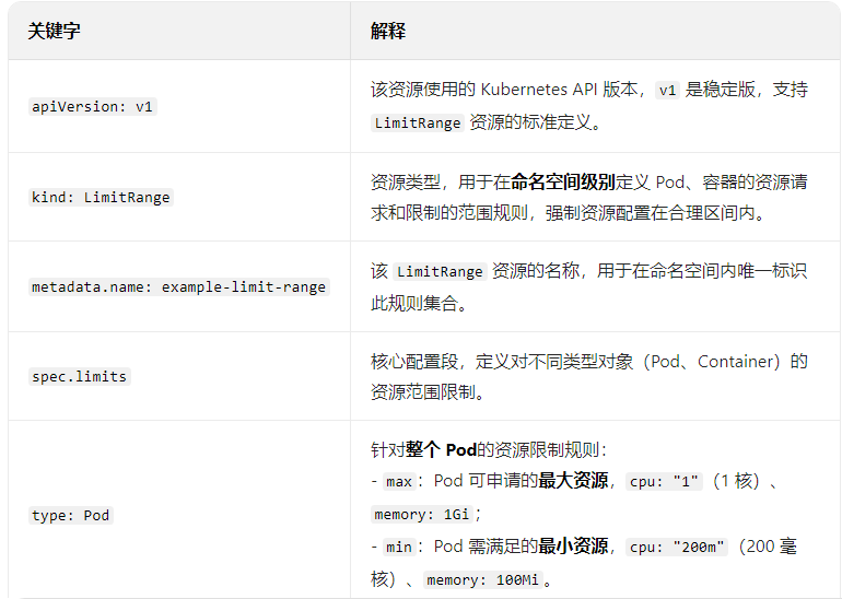 LimitRange的核心作用是在命名空间内强制资源配置的合理性,避免 Pod / 容器无限制申请资源或资源配置过低导致调度 / 运行异常,是 Kubernetes 资源管理的重要手段之一。