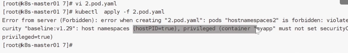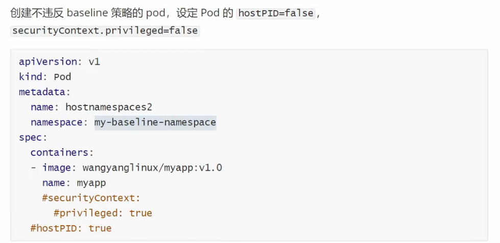 apiVersion: v1 kind: Pod metadata: name: hostnamespaces2 namespace: my-baseline-namespace spec: containers: - image: wangyanglinux/myapp:v1.0 name: myapp securityContext: privileged: true hostPID: true