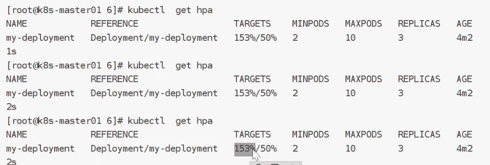 my-deployment这个 Deployment 创建水平 Pod 自动扩缩器(HPA),实现基于 CPU 使用率的自动扩缩容。- 参数解释 :