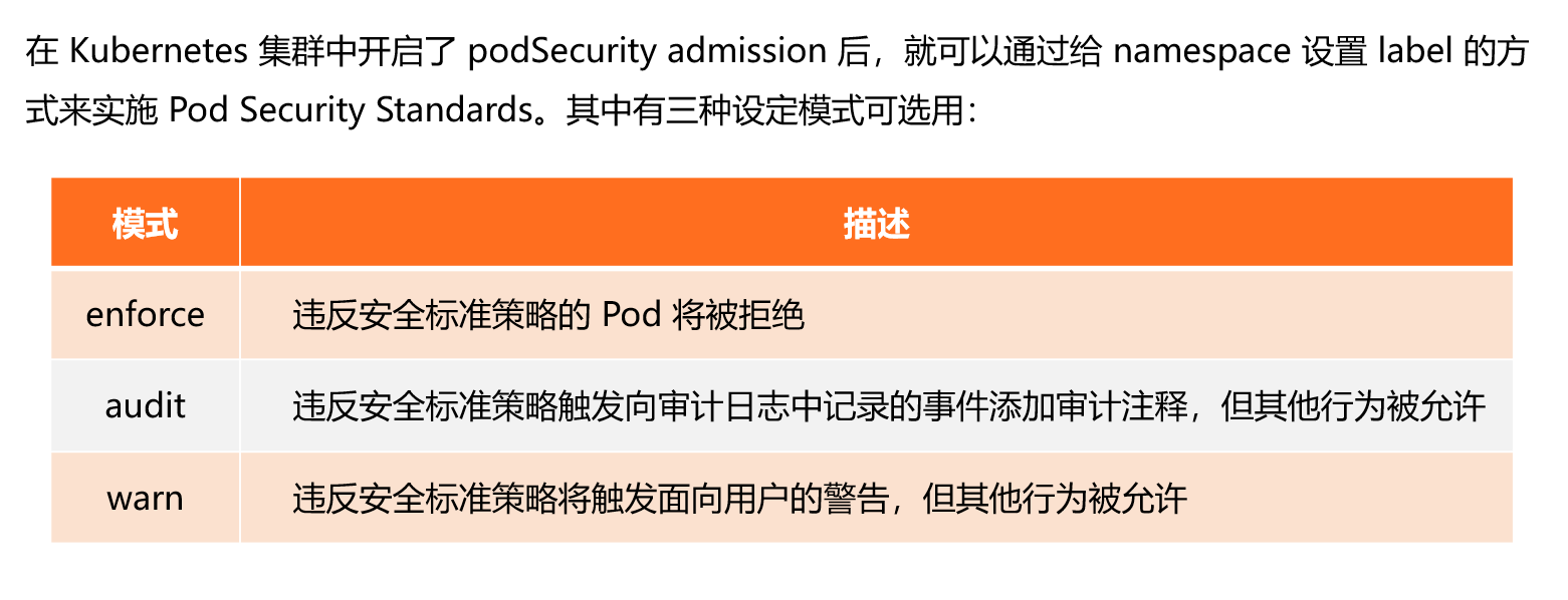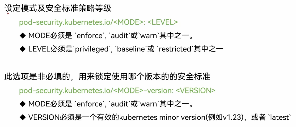 apiVersion: v1 kind: Namespace metadata: name: my-restricted-namespace labels: pod-security.kubernetes.io/enforce: restricted pod-security.kubernetes.io/enforce-version: v1.29 #pod-security.kubernetes.io/warn: restricted #pod-security.kubernetes.io/warn-version: v1.29