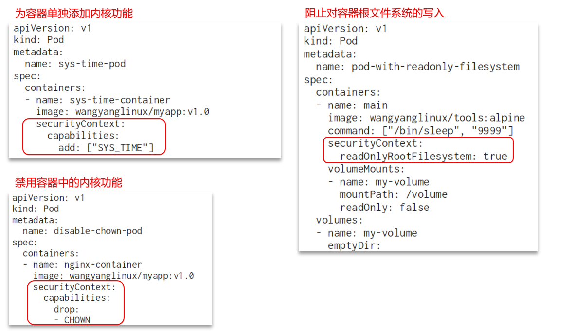 apiVersion: v1 kind: Pod metadata: name: sys-time-pod spec: containers: - name: sys-time-container image: wangyanglinux/myapp:v1.0 securityContext: capabilities: add: ["NET_ADMIN"] # 新增 NET_ADMIN 内核功能(如网络配置权限)不加的话没有权限(修改ip)
