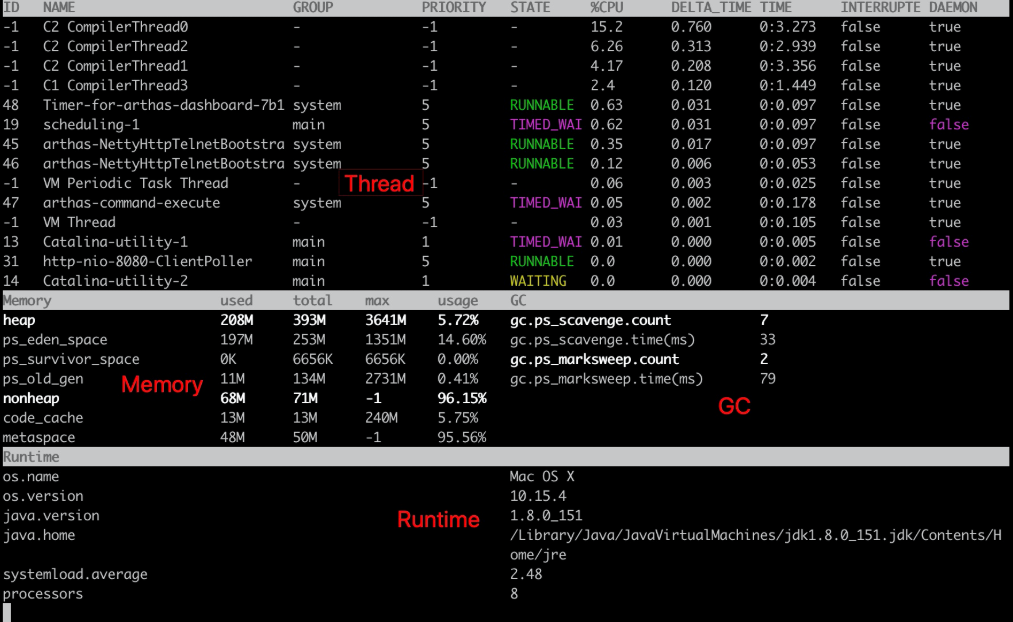 - Arthas 之 dashboard (当前系统实时数据面板,ctrl+c 退出)了解更多到 工具文档 。