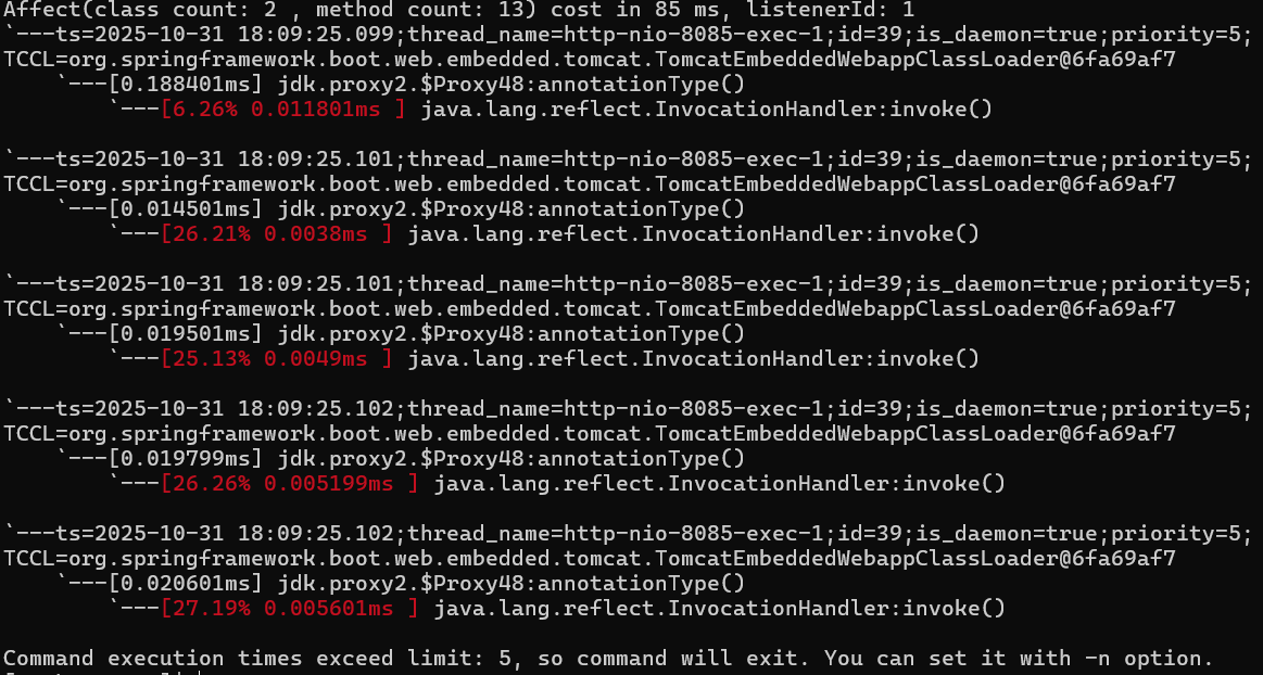 对于日常开发与运维来说,这些基础命令已能覆盖大部分高频场景:排查接口响应慢时,trace 能帮你定位到耗时的方法节点;监控应用健康状态时,dashboard 可实时展示内存、GC、CPU 占用;需了解 JVM 配置与运行信息时,jvm 命令则提供了完整的视角。不过使用时也有小细节需要留意,比如用 trace 时记得通过 -n 参数控制执行次数(如文中的 -n 5),避免无限制输出占用资源;若无需追踪 JDK 原生方法,也可将 --skipJDKMethod 设为 true 简化输出结果。