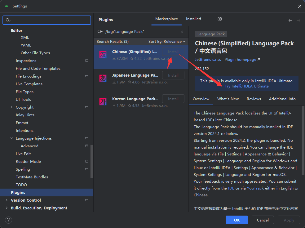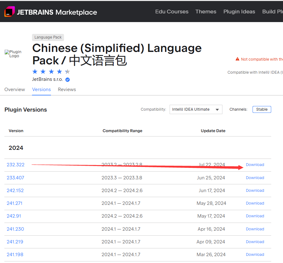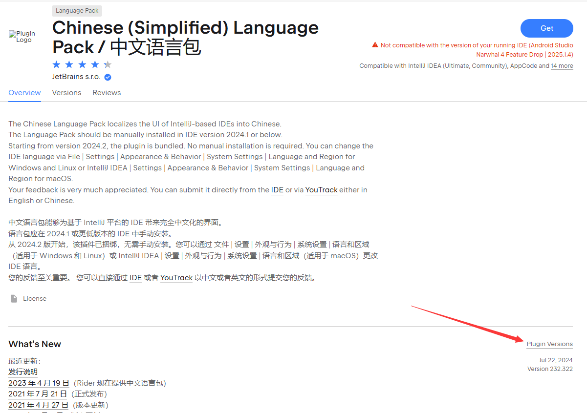 2024.1 开始, IntelliJ IDEA 正式将多语言支持集成到了核心功能中 ,不在用插件的形式,IntelliJ IDEA安装程序中,可以拿到的高版本的中文包,我测试时提示下面错误,没有成功: