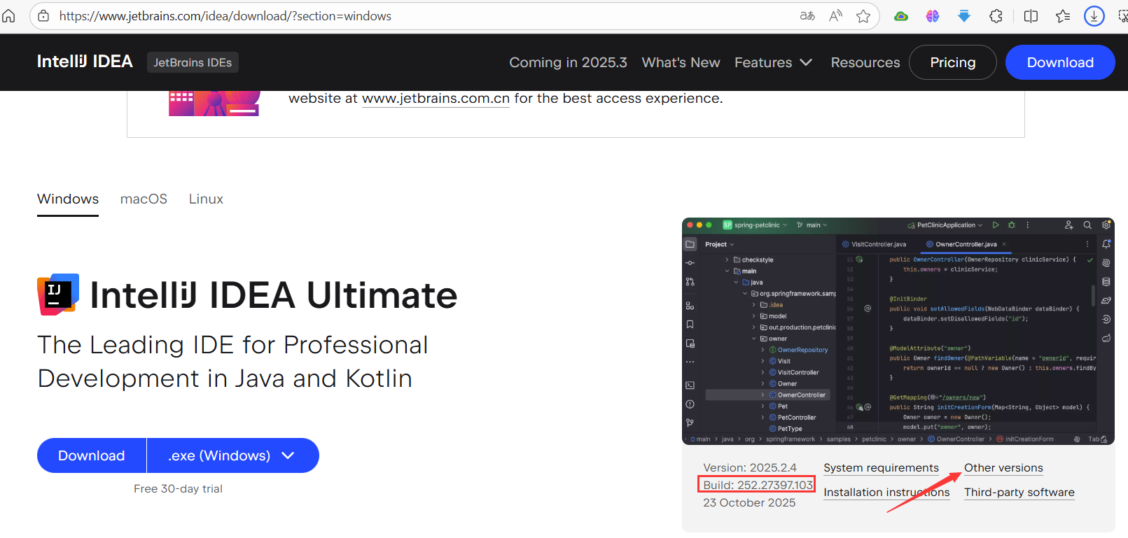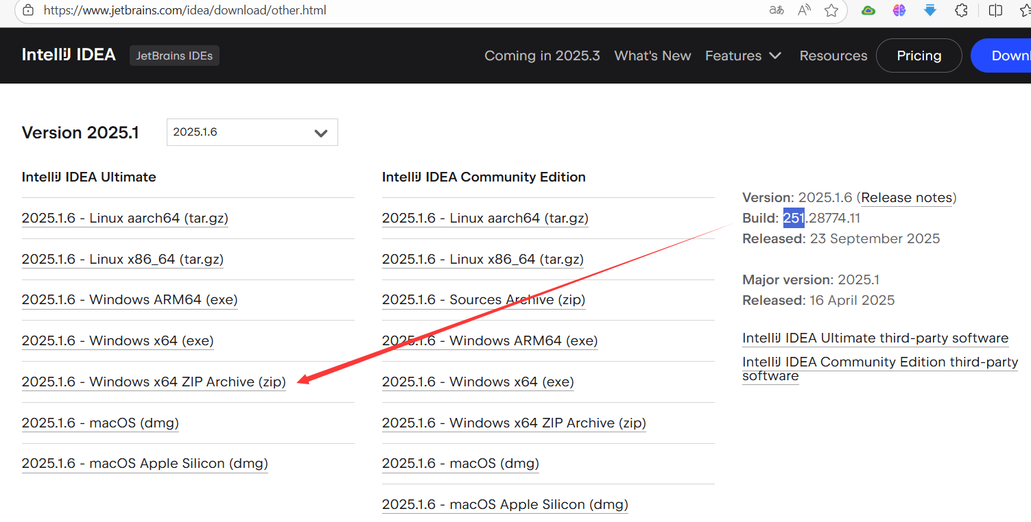 自动跳转到下载页:https://www.jetbrains.com/idea/download/?section=windows,要下载对应的版本,