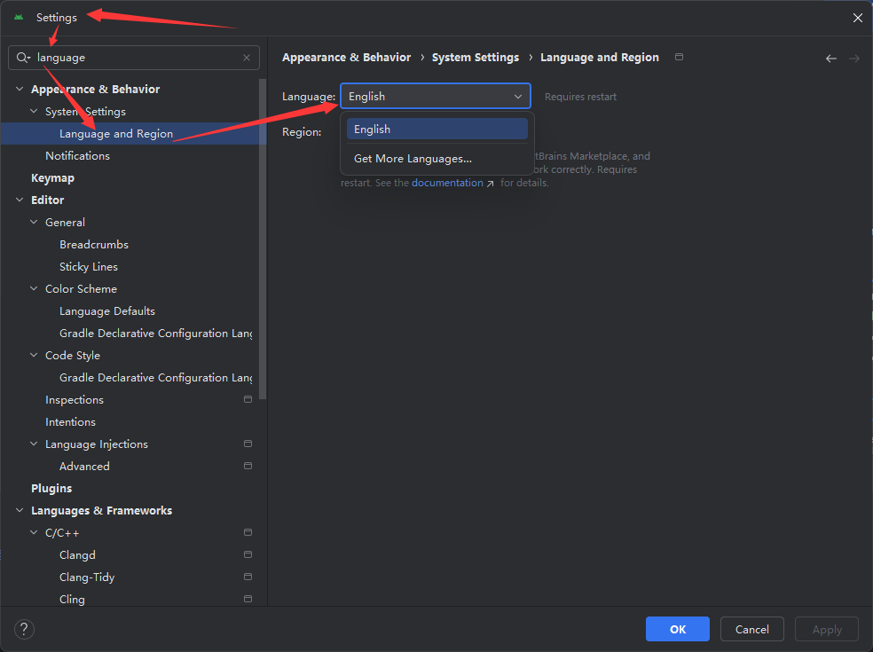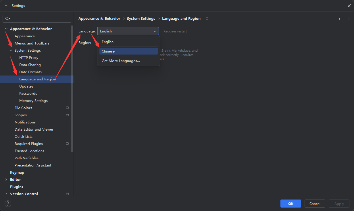 菜单file->settings,看到其中没有中文语言包