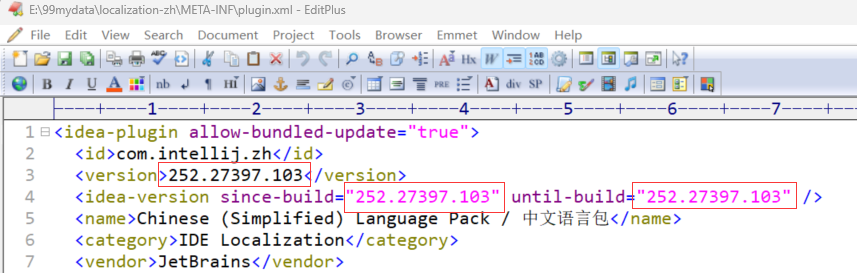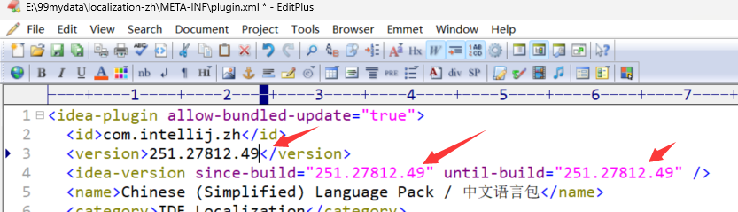 修改中文语言包的版本号,用文本文件编辑修改语言包中的配置文件,localization-zh\META-INF\plugin.xml,把其中的版本号,修改为当前Android Studio的版本号,如下图: