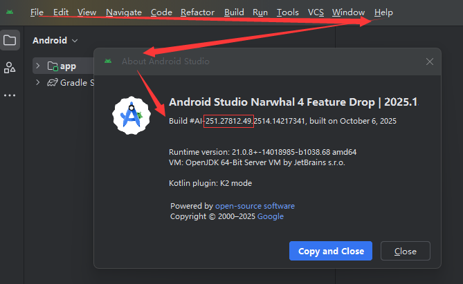 查看并获得 Android Studio的版本号,通过File->Help->about查看,首先是2025.1版本,然后拷贝版本前三段数字(我这里是251.27812.49),备用:AI-251.27812.49
