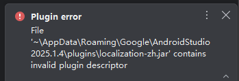File '~\AppData\Roaming\Google\AndroidStudio2025.1.4\plugins\localization-zh.jar' contains invalid plugin descriptor