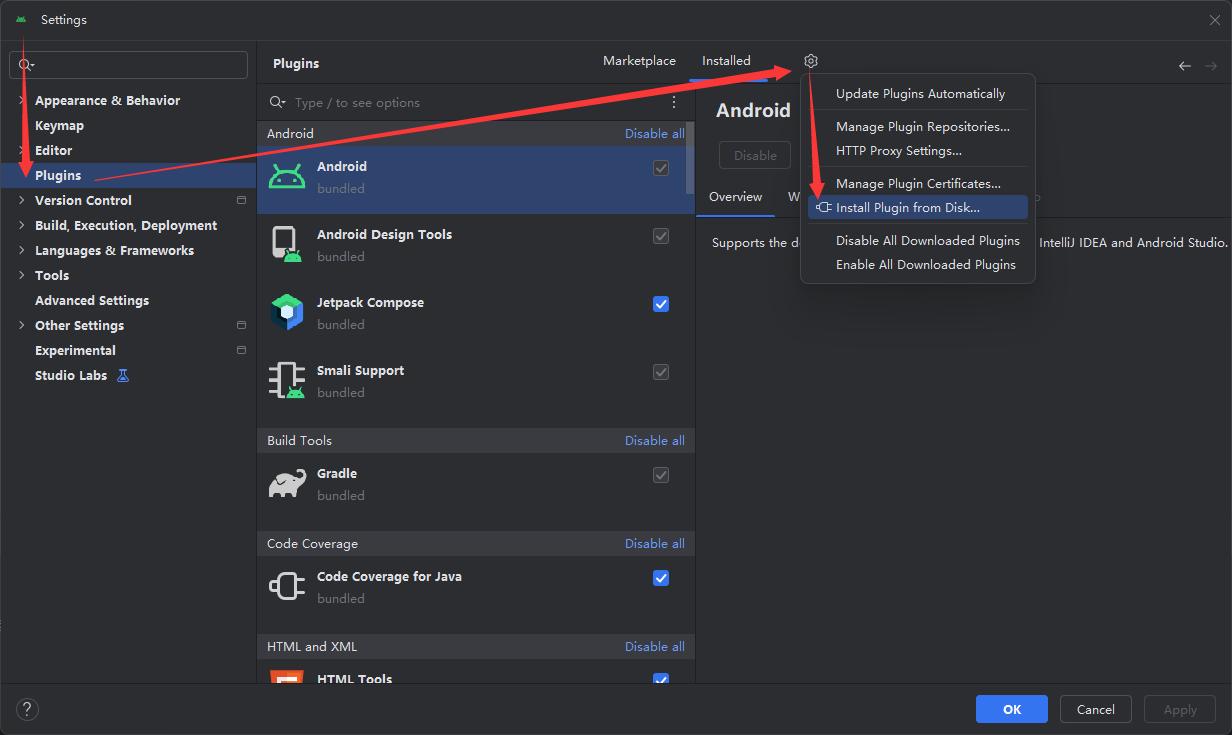 菜单File--->Settings--->plugins--->设置齿轮--->install plugin from disk...