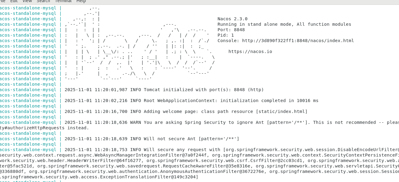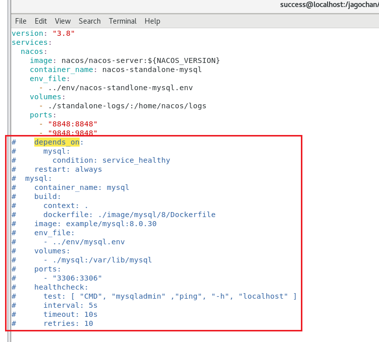 nacos-docker-2.3.1/example/standalone-mysql-8.yaml文件,把其中 mysql 的镜像和 nacos 对 mysql的依赖都注释掉- 我们使用的是自己创建的MySQL
