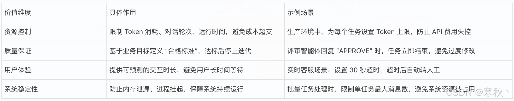 - 兼容性 :确保自定义条件与 AutoGen 版本兼容(继承 TerminationCondition 时,关注方法签名是否匹配最新版本)。
